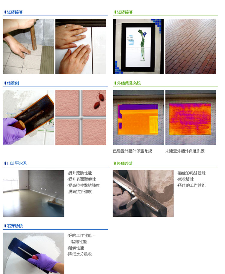 是由VAE乳液经喷雾干燥后所形成可自由流动之醋酸乙烯-乙烯共聚合物的白色粉末,很容易再乳化分散于水中,形成安定的乳液。除了拥有 VAE 乳液原有之优越性能外,并因它是一种可自由流动的粉末,故在搬运及储存时有极佳之方便性及可靠性,是可与其它粉末状混和的材料,如:水泥、砂,轻量骨材等,在生产工厂可依一定配比于干式状态下计量混合搅拌来得到质量优良且稳定之粉末型产品,如此可减低现场施工以乳液状混合计量时之操作困扰及误差,可使用于建筑材料和接着剂以作为黏结剂之用。而在一般之水泥砂浆配方中,可改善其接着强度、抗垂流性能、柔韧性、表面抗磨耗、抗冲击性和涂抹操作性,特殊型号还能增强其疏水表现及自流坪效果。