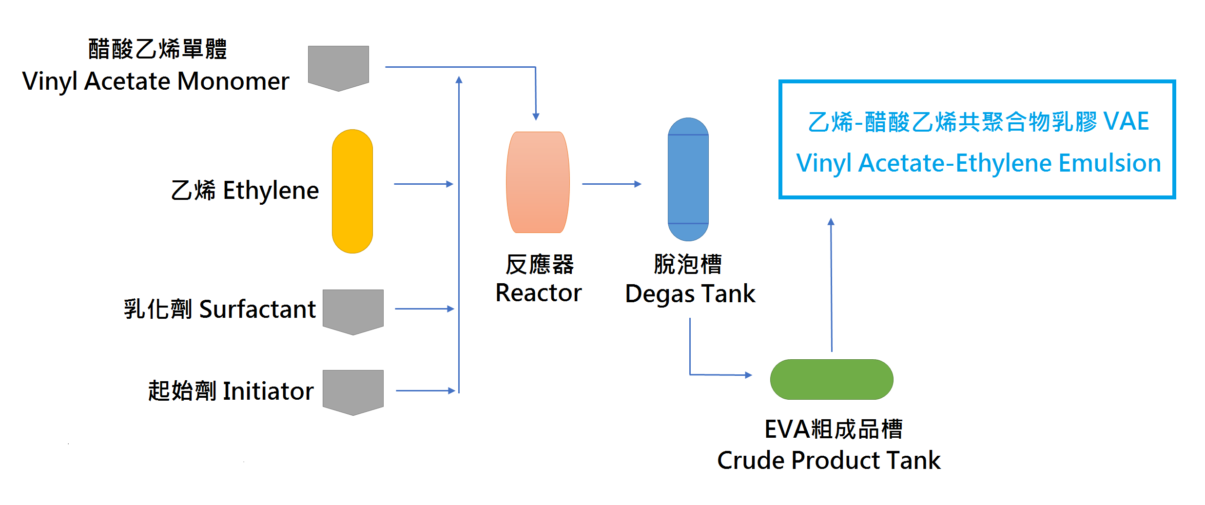 主原料为醋酸乙烯(VAM)及乙烯(ethylene)共聚而成,依照产品外观可分别为VAE乳液及VAE胶粉两大类产品;